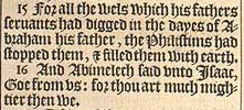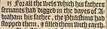 15 For all the wels which his fathers seruants had digged in the dayes of Abraham his father, the Philistims had stopped them, & filled them with earth.