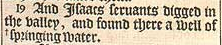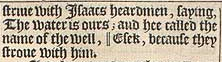20 And the heardmen of Gerar did striue with Isaacs heardmen, saying, The water is ours; and hee called the name of the well, || Esek, because they stroue with him. [ || That is, Contention. ]