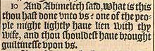 10 And Abimelech said, What is this thou hast done vnto vs? one of the people might lightly haue lien with thy wife, and thou shouldest haue brought guiltinesse vpon vs.