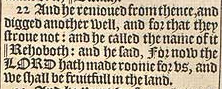 22 And he remoued from thence, and digged another well, and for that they stroue not: and he called the name of it || Rehoboth: and he said, For now the LORD hath made roome for vs, and we shall be fruitfull in the land. [ || That is, roome. ]
