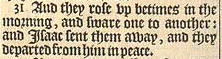 31 And they rose vp betimes in the morning, and sware one to another: and Isaac sent them away, and they departed from him in peace.