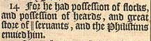 14 For he had possession of flocks, and possession of heards, and great store of || seruants, and the Philistims enuied him. [ || Or, husbandry. ]