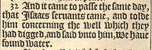 32 And it came to passe the same day, that Isaacs seruants came, and tolde him concerning the well which they had digged, and said vnto him, we haue found water.
