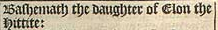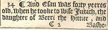 34 ¶ And Esau was forty yeeres old, when he tooke to wife Iudith, the daughter of Beeri the Hittite, and Bashemath the daughter of Elon the Hittite: