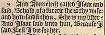 9 And Abimelech called Isaac and said, Behold, of a suretie she is thy wife: and how saidst thou, She is my sister? And Isaac said vnto him, Because I said, Lest I die for her.