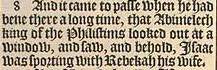 8 And it came to passe when he had bene there a long time, that Abimelech king of the Philistims looked out at a window, and saw, and behold, Isaac was sporting with Rebekah his wife.
