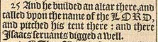 25 And he builded an altar there, and called vpon the name of the LORD, and pitched his tent there: and there Isaacs seruants digged a well.