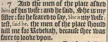 7 And the men of the place asked him of his wife: and he said, She is my sister: for he feared to say, She is my wife; lest, said he, the men of the place should kill me for Rebekah, because shee was faire to looke vpon.