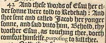 42 And these words of Esau her elder sonne were told to Rebekah: And shee sent and called Iacob her yonger sonne, and said vnto him, Behold, thy brother Esau, as touching thee, doeth comfort himselfe, purposing to kill thee.