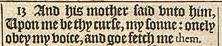 13 And his mother said vnto him, Upon me be thy curse, my sonne: onely obey my voice, and go fetch me them.