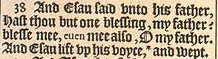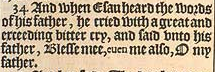 38 And Esau said vnto his father, Hast thou but one blessing, my father? blesse mee, euen mee also, O my father. And Esau lift vp his voyce, * and wept. [ * Heb.12. 17. ]