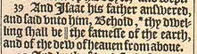 39 And Isaac his father answered, and said vnto him, Behold, *thy dwelling shall be || the fatnesse of the earth, and of the dew of heauen from aboue. [ *Verse 28. , || Or, of the fatnesse. ]