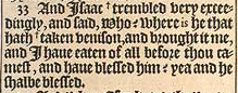 33 And Isaac +trembled very exceedingly, and said, Who? Where is he that hath +taken venison, and brought it me, and I haue eaten of all before thou camest, and haue blessed him? yea and he shalbe blessed. [+ Hebr. trembled with a great trembling greatly. , + Hebr. hunted.]