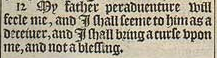 12 Mein vater wird mich vielleicht fühlen und ich werde ihm wie ein Betrüger erscheinen und ich werde einen Fluch auf mich bringen, keinen Segen.”