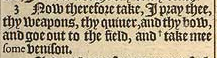 3 Now therefore take, I pray thee, thy weapons, thy quiuer, and thy bow, and goe out to the field, and +take mee some venison. [ + Heb. hunt. ]