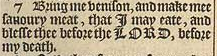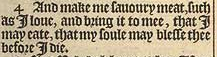 4 And make me sauoury meat, such as I loue, and bring it to mee, that I may eate, that my soule may blesse thee before I die.