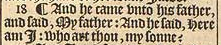 18 ¶ And he came vnto his father, and said, My father: And he said, Here am I: who art thou, my sonne?