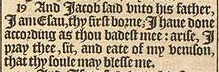 25 Und er sagte “Bringe es näher zu mir und ich will vom Wildbret meines Sohnes essen, dass meine Seele dich segne”: Und er brahct es näher zu ihm und er aß: Und er bracht eihm Wein und er trank.