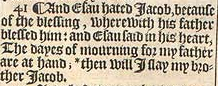 41 ¶ And Esau hated Iacob, because of the blessing, wherewith his father blessed him: and Esau said in his heart, The dayes of mourning for my father are at hand; *then will I slay my brother Iacob. [ * Obad. 10. ]