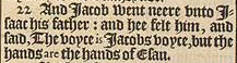 22 And Iacob went neere vnto Isaac his father: and hee felt him, and said, The voyce is Iacobs voyce, but the hands are the hands of Esau.