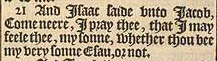 21 And Isaac saide vnto Iacob, Come neere, I pray thee, that I may feele thee, my sonne, whether thou bee my very sonne Esau, or not.