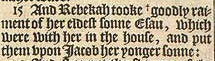 15 And Rebekah tooke +goodly raiment of her eldest sonne Esau, which were with her in the house, and put them vpon Iacob her yonger sonne: [+ Hebr. desireable.]