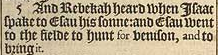 5 And Rebekah heard when Isaac spake to Esau his sonne: and Esau went to the fielde to hunt for venison, and to bring it.
