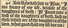 46And Rebekah said to Isaac, *I am weary of my life, because of the daughters of Heth: If Iacob take a wife of the daughters of Heth, such as these which are of the daughters of the land, what good shall my life doe me? [ * Chap. 26.35. ]