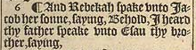 6 ¶ And Rebekah spake vnto Iacob her sonne, saying, Behold, I heard thy father speake vnto Esau thy brother, saying,