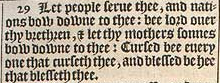 29 Let people serue thee, and nations bow downe to thee: bee lord ouer thy brethren, & let thy mothers sonnes bow downe to thee: Cursed bee euery one that curseth thee, and blessed be hee that blesseth thee.