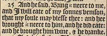 25 And he said, Bring it neere to me, and I will eate of my sonnes venison, that my soule may blesse thee: and hee brought it neere to him, and he did eate: and he brought him wine, & he dranke.