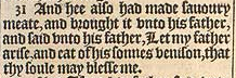 31 And hee also had made sauoury meate, and brought it vnto his father, and said vnto his father, Let my father arise, and eat of his sonnes venison, that thy soule may blesse me.