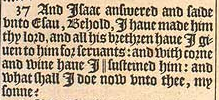 37 And Isaac answered and saide vnto Esau, Behold, I haue made him thy lord, and all his brethren haue I giuen to him for seruants: and with corne and wine haue I ||susteined him: and what shall I doe now vnto thee, my sonne? [ || Or, supported.]