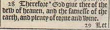 28 Therefore *God giue thee of the dew of heauen, and the fatnesse of the earth, and plenty of corne and wine. [ * Heb.11. 20. ]