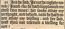 36 And he said, Is not he rightly naned || Iacob? for he hath supplanted me these two times: hee tooke away my birthright, and behold, now he hath taken away my blessing: and hee said, Hast thou not reserued a blessing for mee? [ || That is, A supplanter. ]