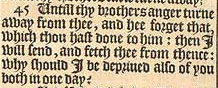 45 Untill thy brothers anger turne away from thee, and hee forget that, which thou hast done to him: then I will send, and fetch thee from thence: why should I be depriued also of you both in one day?