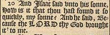 20 And Isaac said vnto his sonne, How is it that thou hast found it so quickly, my sonne? And he said, Because the LORD thy God brought it +to me. [+ Hebr. before me. ]