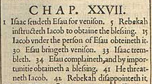 1 Isaak schick Esau nach Wildbret. 5 Rebekka belehrt Jakob den Segen zu erlangen. 15 Jakob erlangt ihn durch die Person Esaus. 30 Esau bringt Wildbret. 33 Isaak schaudert. 34 Esau beschwert sich und erlangt durch Beharrlichkeit einen Segen. 41 Er bedroht Jakob. 42 Rebekka ist davon enttäuscht.