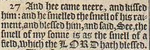27 And hee came neere, and kissed him: and he smelled the smell of his raiment, and blessed him, and said, See, the smell of my sonne is as the smell of a field, which the LORD hath blessed.