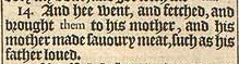 14 And hee went, and fetched, and brought them to his mother, and his mother made sauoury meat, such as his father loued.