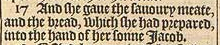 17 And she gaue the sauoury meate, and the bread, which she had prepared, into the hand of her sonne Iacob.