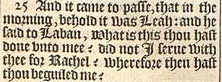 25 And it came to passe, that in the morning, behold it was Leah: and he said to Laban, What is this thou hast done vnto mee? did not I serue with thee for Rachel? wherefore then hast thou beguiled me?