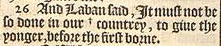26 And Laban said, It must not be so done in our + countrey, to giue the yonger, before the first borne. [ +Heb. place. ]