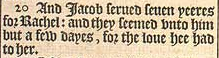 20 And Iacob serued seuen yeeres for Rachel: and they seemed vnto him but a few dayes, for the loue hee had to her.