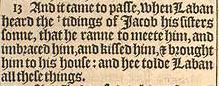 13 And it came to passe, when Laban heard the + tidings of Iacob his sisters sonne, that he ranne to meete him, and imbraced him, and kissed him, & brought him to his house: and hee tolde Laban all these things. [ +Heb. hearing. ]