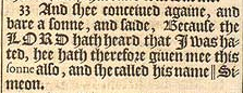 33 And shee conceiued againe, and bare a sonne, and saide, Because the LORD hath heard that I was hated, hee hath therefore giuen mee this sonne also, and she called his name || Simeon. [ || That is, Hearing. ]