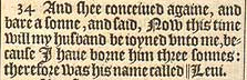 34 And shee conceiued againe, and bare a sonne, and said, Now this time will my husband be ioyned vnto me, because I haue borne him three sonnes: therefore was his name called || Leui. [ || That is, ioyned.]