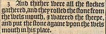 3 And thither were all the flockes gathered, and they rolled the stone from the wels mouth, & watered the sheepe, and put the stone againe vpon the wels mouth in his place.