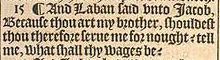 15 ¶ Und Laban sagte zu Jakob “Weil du mein Bruder bist, solltest du mir für nichts dienen? Sag mir was dein Preis sein soll?”