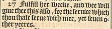 27 Fulfill her weeke, and wee will giue thee this also, for the seruice which thou shalt serue with mee, yet seuen other yeeres.